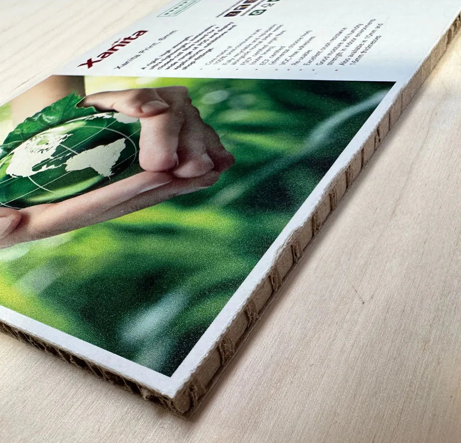 Xanita Print is a natural fibre based board consisting of a recycled kraft core sandwiched between printable white kraft liners. The high crush strength kraft core is manufactured from